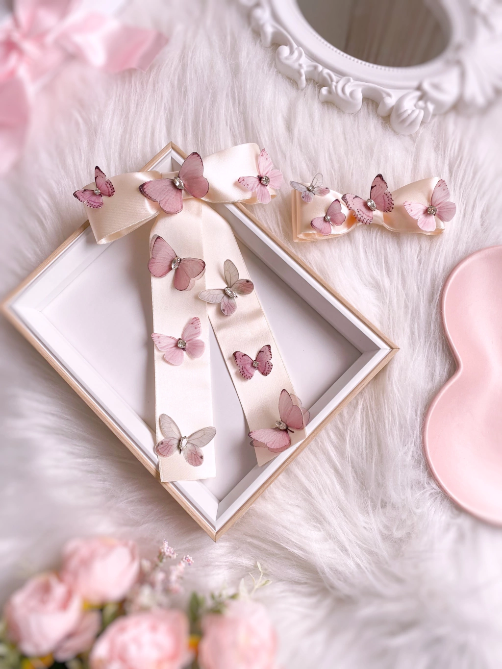 Conjunto de dois laços em cetim, com aplicação de borboletas. O maior, com pontas, está aplicado na presilha e o menor no bico de pato.