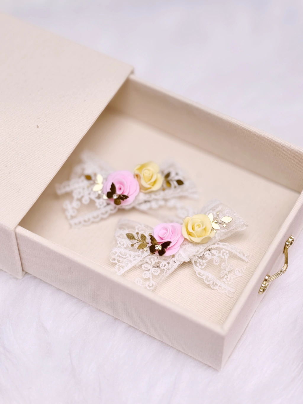 Laço em renda importada com detalhes em flores de procelana e em tecido aplicados no bico de pato, o laço Maria pode ser adquirido tanto o par quanto a unidade.