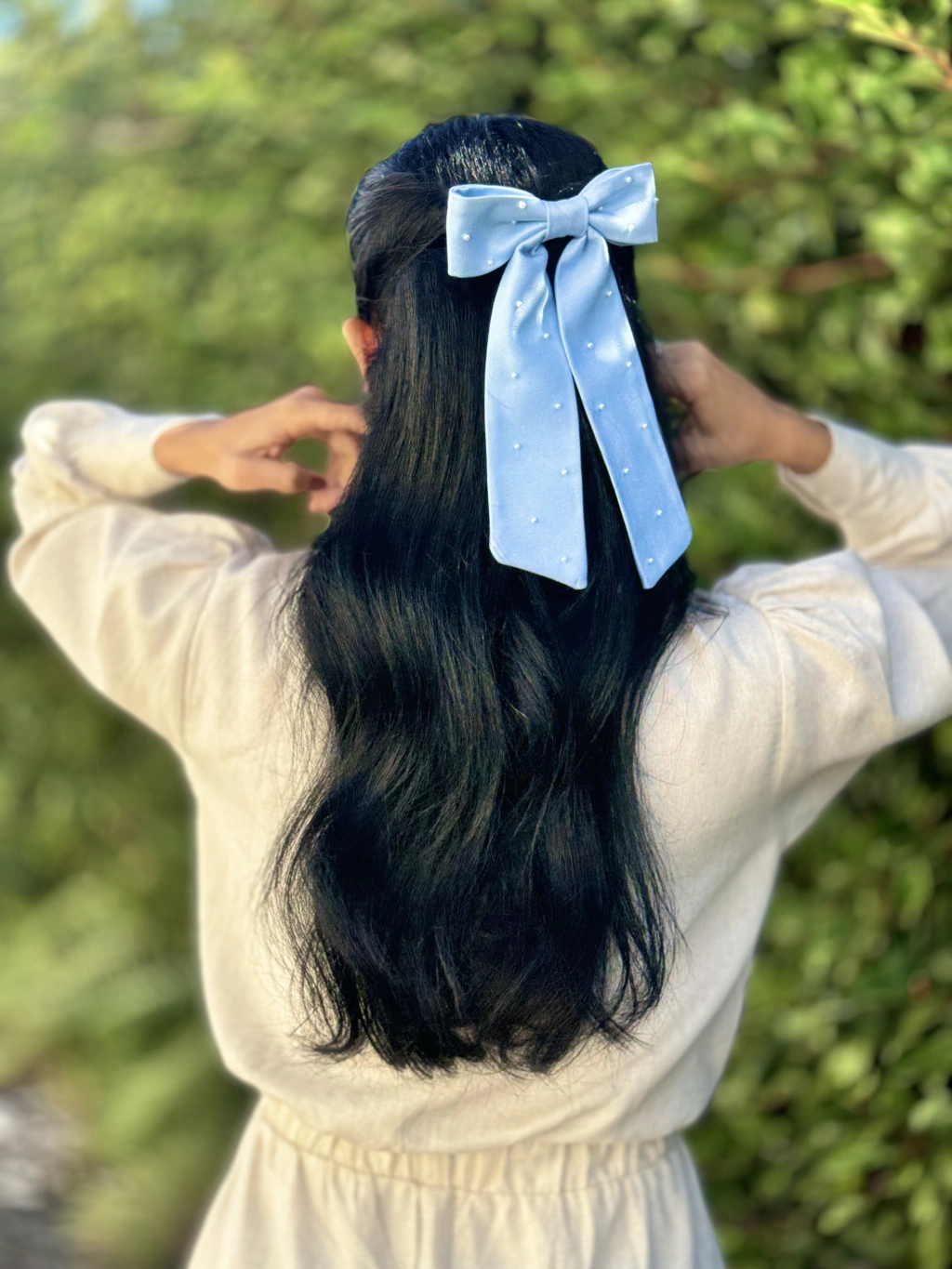 O nosso laço em crepe acetinado com toque de seda é feito com entretela, seguindo técnicas de alfaiataria, para manter a estrutura do laço ao longo dos anos, o laço Karen também possui aplicação de mini pérolas para agregar mais delicadeza e romantismo a peça, possui presilha encapada com duas travas.