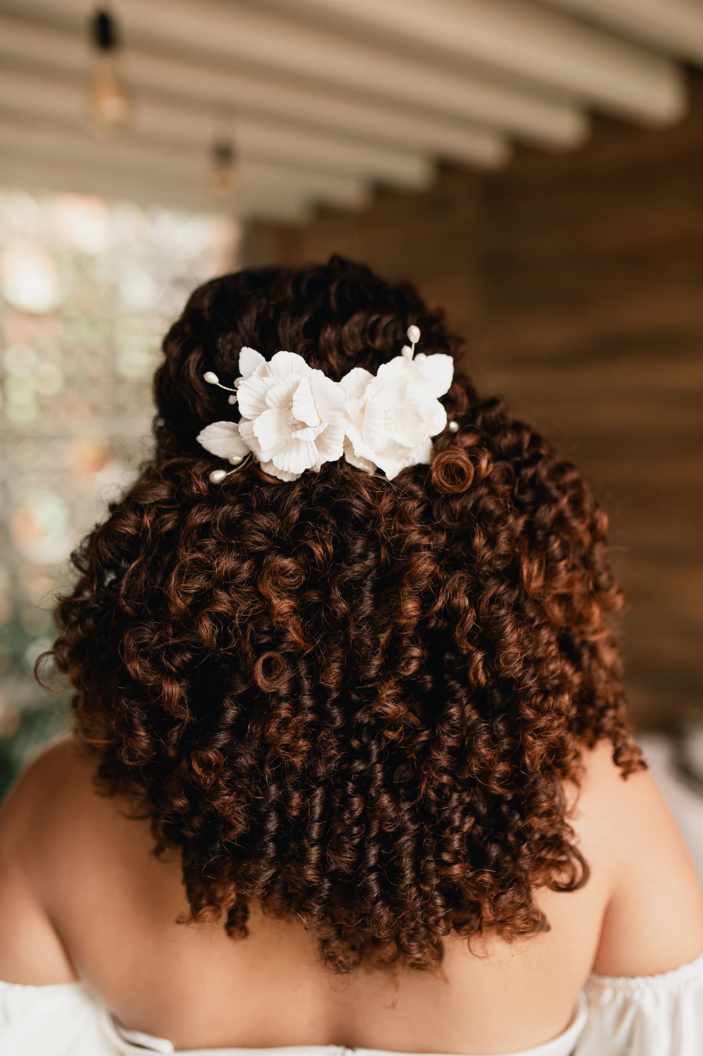 Ele é composto por flores moldadas à mão, com miolo trabalhado em mini-pérolas e mini-cristais, criando um ponto de luz discreto e sofisticado.